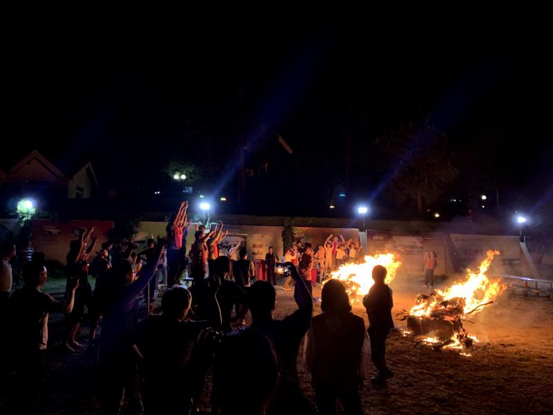 夜幕四合,工會(huì)主席王志凌點(diǎn)燃了火把,拉開(kāi)了篝火晚會(huì)的序幕。在輕快歡快的音樂(lè)節(jié)拍下,紅藍(lán)兩隊(duì)隊(duì)員們手拉著手、肩并肩圍著熊熊篝火歡呼著、舞動(dòng)著、跳躍著、歌唱著,隊(duì)員們完全沉浸在歡樂(lè)的海洋里……當(dāng)《朋友》之歌響起時(shí),在場(chǎng)所有人一起放聲歌唱,將本次活動(dòng)的氣氛推向高潮!